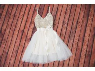 This dress is simply stunning! It features a shimmering gold sequin bodice with delicate gold elastic spaghetti straps, paired with a soft ivory tulle tutu skirt for an elegant look. A removable embellished bow sash adds extra charm, making it perfect for weddings, parties, and any special occasion.