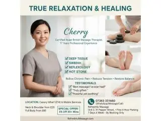 Experience true relaxation and healing with Cherry, acertified Asian British massage therapist offering 17 years of professional experience in multiple therapeutic techniques. Cherry specializes indeep tissue massage,Swedish massage,reflexology, andhot stone massage each designed to relieve chronic pain, reduce tension, and restore balance to body and mind.